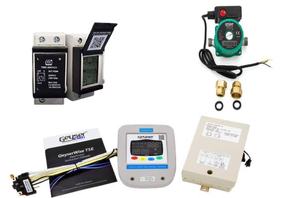 The Geyserwise Spares range includes Displays, Power Supplies, Electronic Thermostats, Solar Circulation Pumps, High-Temperature Probes, PV Panels, PTC Elements and Extension Cables.